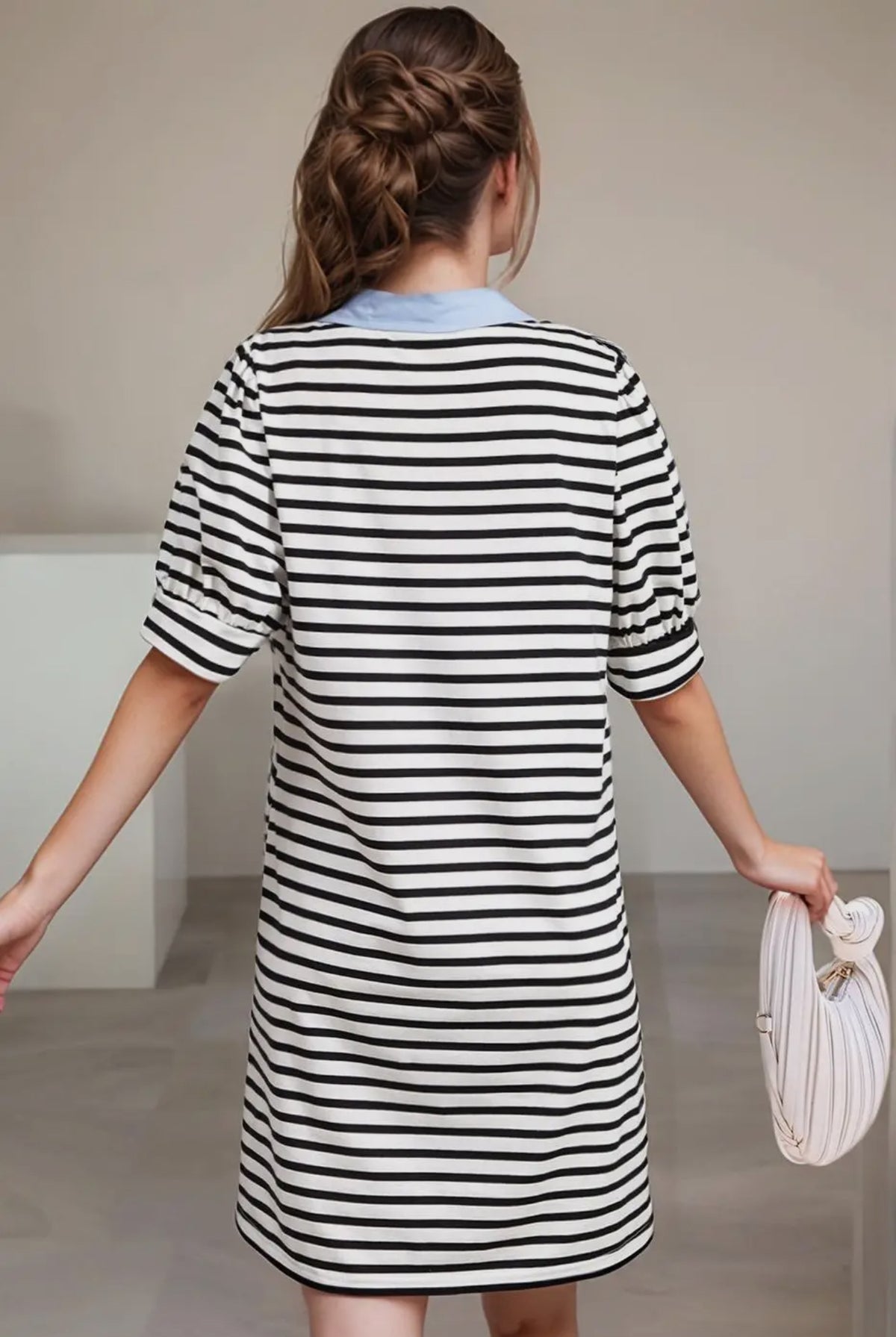 Laid back meets charming in this casual striped dress, featuring playful puff sleeves and a relaxed fit. An easy go-to for warm days and effortless style.